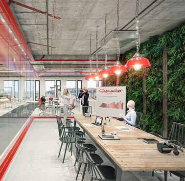 Für die Büroflächen im Turm entwarfen wir das komplette Interior Design. Passend zur Historie des Areals entschieden wir uns für einen coolen Industrial Chic mit Grünwänden und dem Rot des Glasmacherviertels.